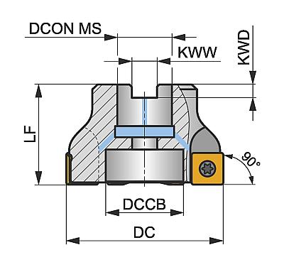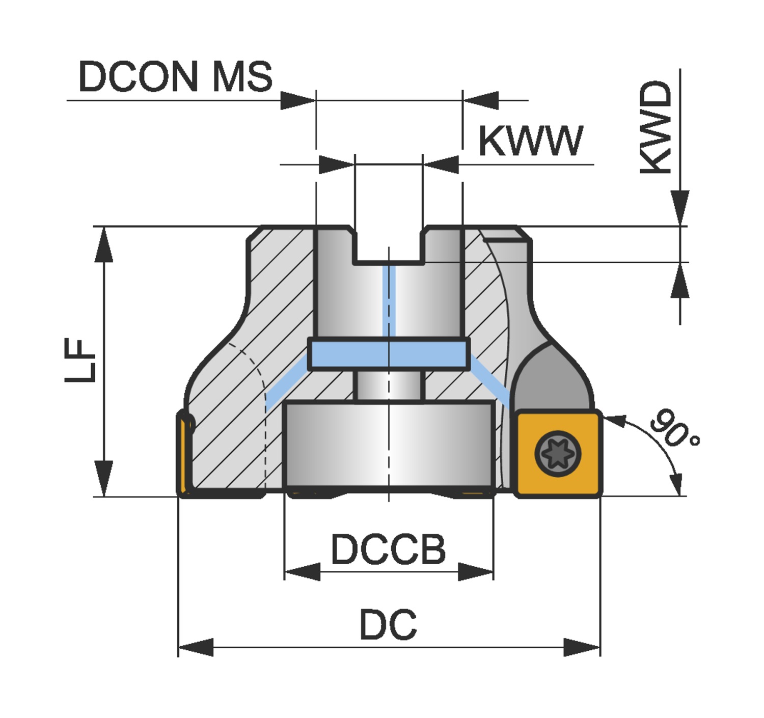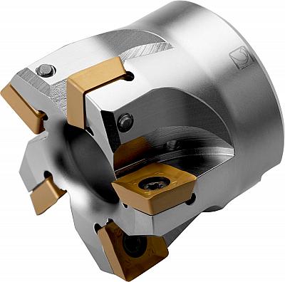 Фреза для обработки уступов с позитивно-негативной геометрией, количество зубьев 8, -SDMT 1205., односторонние пластины, диаметр фрезы от 100 мм с 90° углом в плане и 32 мм насадным хвостовиком с пазом в соответствии с DIN 8030-A. 50 мм вылет, внутренний подвод СОЖ для неглубокого фрезерования карманов и уступов, неглубокого фрезерования пазов и плунжерного фрезерования с максимальной глубиной резания 10.0 мм.