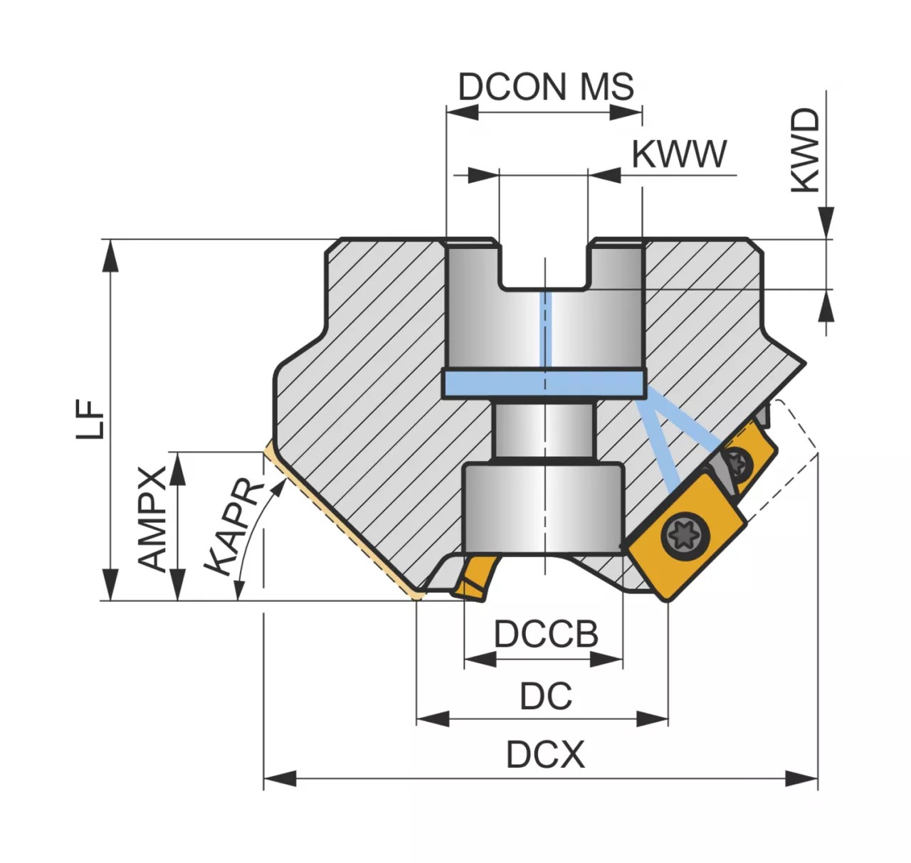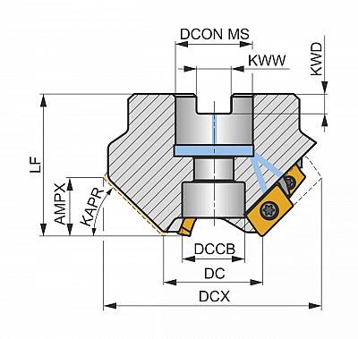 Фреза для обработки фасок с позитивно-негативной геометрией, количество зубьев 6 -XPHT 1604.. односторонние пластины, диаметр фрезы от 35 до 76.1 мм с 45° углом в плане и 27 мм насадным хвостовиком с пазом в соответствии с DIN 8030, 50 мм вылет, внутренний подвод СОЖ для фрезерования фасок с максимальной глубиной резания 20 мм.