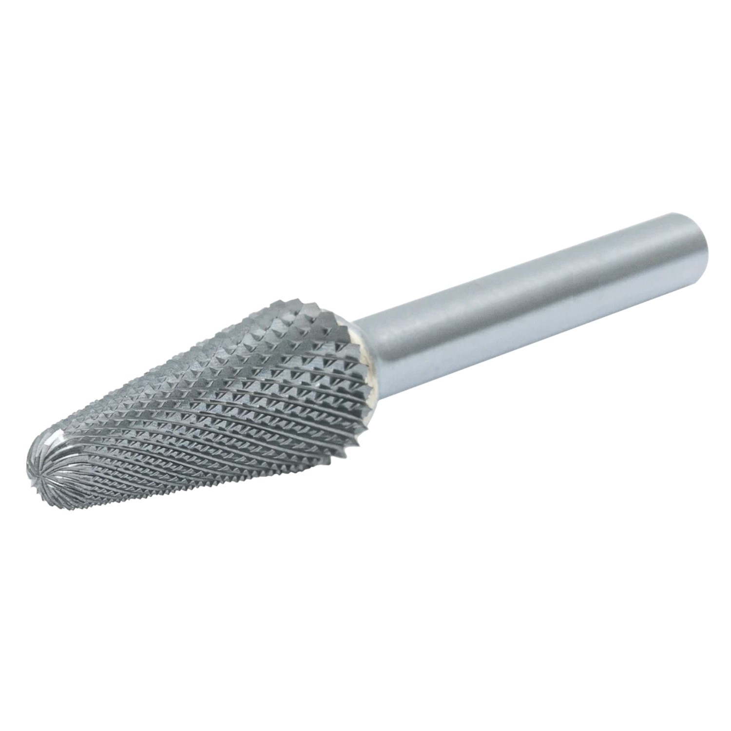 Твердосплавная бор-фреза сфероконическая Тип L. Размеры : диаметр рабочей части 14 мм, диаметр хвостовика 6 мм, длина рабочей части 28 мм, длина хвостовика 45 мм. Алмазная насечка.